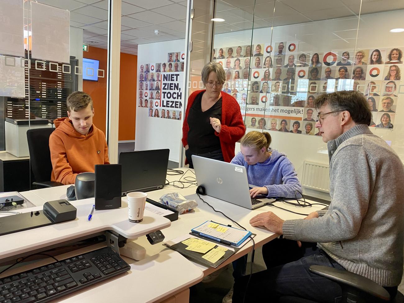 Wout en Aniek aan het werk met stemcoach Jeroen en Rianne, manager Klantenservice Aniek en stemcoach Jeroen aan het werk bij Dedicon Wout en Aniek aan het werk bij Dedicon