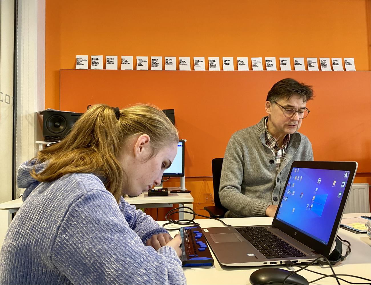 Aniek en Wout zitten in de 4e klas vmbo van Visio Grave, een school voor blinde en slechtziende leerlingen. Een week lang waren beide tieners te gast bij Dedicon. Op stage. En stil zitten was er voor beide stagiaires niet bij: een kijkje in de keuken bij de afdeling Reproductie en Distributie, een bezoek aan de audiostudio’s, zelf een stuk uit de krant voorlezen, gesprekken met de redacteuren Sander en Anja, een website testen, aan de slag met stemcoach Jeroen… Een lekker vol programma dus.
