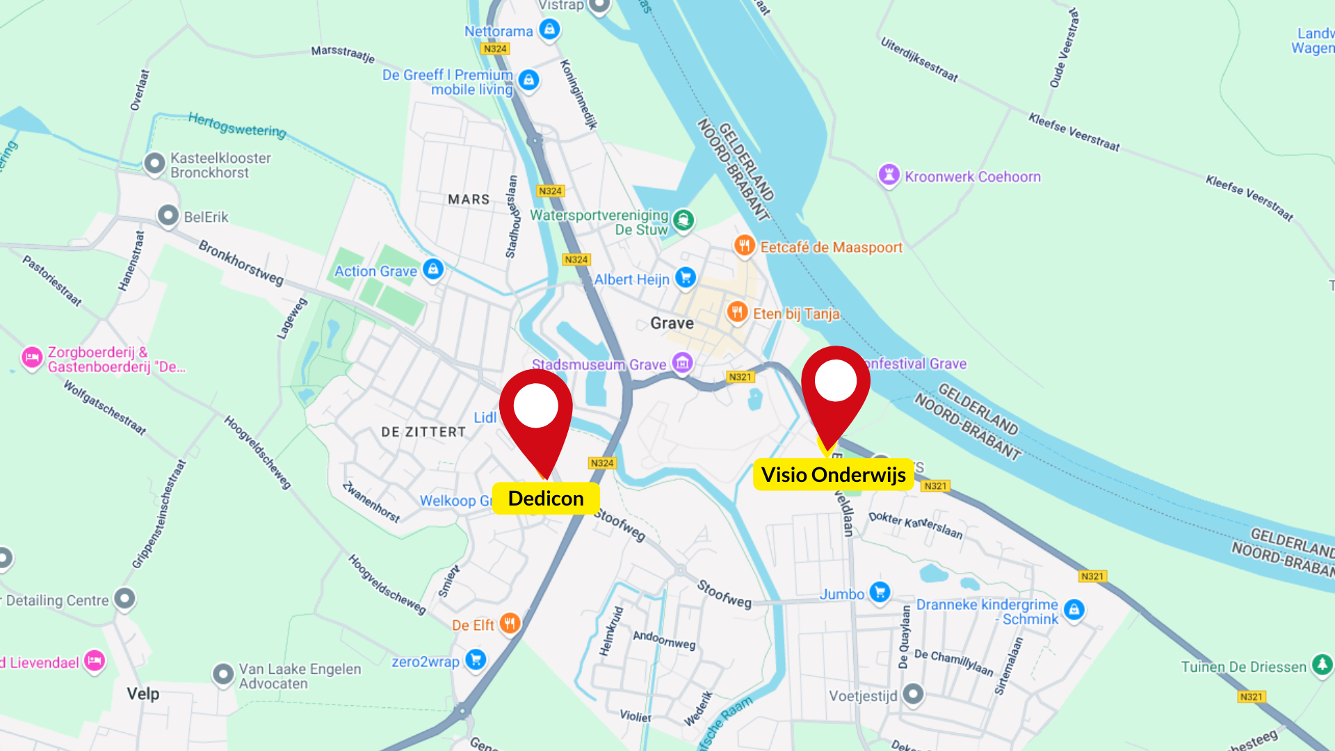 Grave is per OV bereikbaar via buslijn 99 vanuit Nijmegen. Vanaf het busstation Grave is het ca. 15 minuten wandelen naar beide locaties.